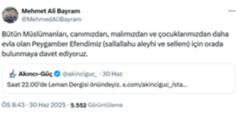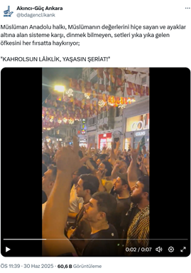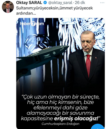 - Cumhurbaşkanı Başdanışmanı Oktay Saral sosyal medya platformu X hesabından yaptığı paylaşımda AKP’li Cumhurbaşkanı R.T. Erdoğan için ”Sultanım; yürüyeceksin, ümmet yürüyecek ardından.” ifadelerini kullandı. (17 Haziran)