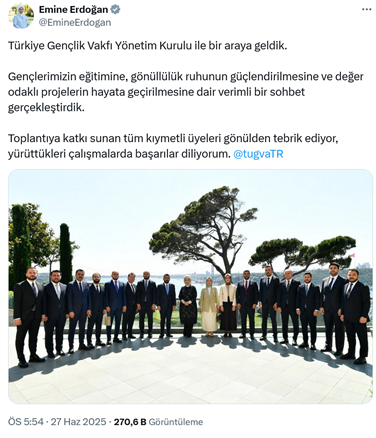 - AKP’li Cumhurbaşkanı R.T. Erdoğan’ın eşi Emine Erdoğan, oğlu Bilal Erdoğan’ın yöneticisi olduğu TÜGVA’nın yönetim kurulu üyeleriyle bir araya geldiğini sosyal medya hesabında duyurdu. (27 Haziran)