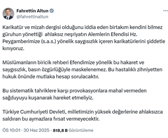 - İslamcı terör örgütü İBDA-C ile bağlantılı Büyük Doğu Akıncılar Teşkilatı isimli grubun, Mizah dergisi Leman’da yayınlanan bir karikatürle ilgili “Hz. Muhammed tasviri” olduğu gerekçesiyle sosyal medyada linç kampanyası başlatarak dergi önüne çağrı yapmasının hemen ardından AKP’li AKP’li Cumhurbaşkanı İletişim Başkanı Fahrettin Altun sosyal medya hesabında “Karikatür ve mizah dergisi olduğunu iddia eden birtakım kendini bilmez güruhun yönettiği ahlaksız neşriyatın Âlemlerin Efendisi Hz. Peygamberimize (s.a.s.) yönelik saygısızlık içeren karikatürlerini şiddetle kınıyoruz. Müslümanların biricik rehberi Efendimize yönelik bu hakaret ve saygısızlık, basın özgürlüğüyle maskelenemez. Bu hastalıklı zihniyetten hukuk önünde mutlaka hesap sorulacaktır. Bu sistematik tahriklere karşı provokasyonlara mahal vermeden sağduyuyu kuşanarak hareket etmeliyiz. Türkiye Cumhuriyeti Devleti, milletimizin yüksek değerlerine ahlaksızca saldıran bu aymazlara fırsat vermeyecektir.” İfadeleriyle paylşaım yaptı. (30 Haziran)