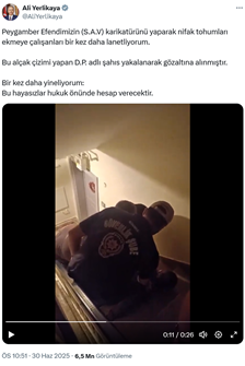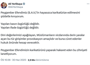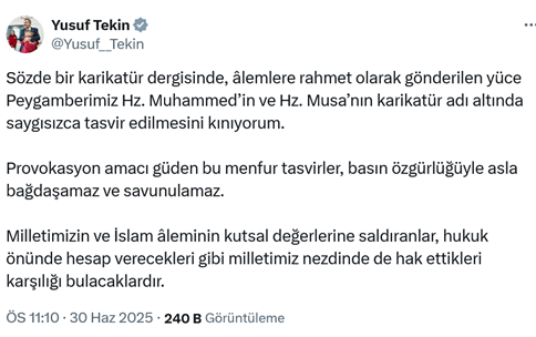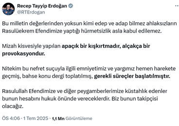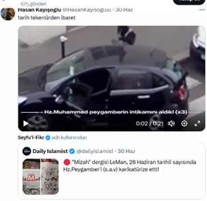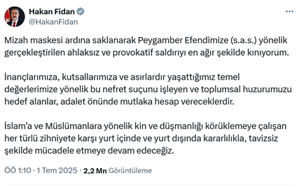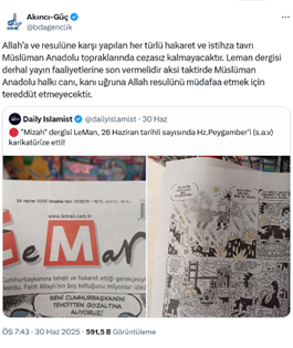 1. İslamcı terör örgütü İBDA-C ile bağlantılı Büyük Doğu Akıncılar Teşkilatı isimli grubun, Mizah dergisi Leman’da yayınlanan bir karikatürle ilgili “Hz. Muhammed tasviri” olduğu gerekçesiyle sosyal medyada linç kampanyası başlatarak dergi önüne çağrı yapmasının hemen ardından AKP’li Dışişleri Bakanlı Hakan Fidan, sosyal medya hesabında yaptığı paylaşımda “Mizah maskesi ardına saklanarak Peygamber Efendimize (s.a.s.) yönelik gerçekleştirilen ahlaksız ve provokatif saldırıyı en ağır şekilde kınıyorum. İnançlarımıza, kutsallarımıza ve asırlardır yaşattığımız temel değerlerimize yönelik bu nefret suçunu işleyen ve toplumsal huzurumuzu hedef alanlar, adalet önünde mutlaka hesap vereceklerdir. İslam’a ve Müslümanlara yönelik kin ve düşmanlığı körüklemeye çalışan her türlü zihniyete karşı yurt içinde ve yurt dışında kararlılıkla, tavizsiz şekilde mücadele etmeye devam edeceğiz.” ifadelerini kullandı. (30 Haziran)