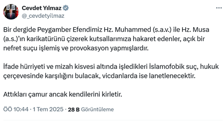 - İslamcı terör örgütü İBDA-C ile bağlantılı Büyük Doğu Akıncılar Teşkilatı isimli grubun, Mizah dergisi Leman’da yayınlanan bir karikatürle ilgili “Hz. Muhammed tasviri” olduğu gerekçesiyle sosyal medyada linç kampanyası başlatarak dergi önüne çağrı yapmasının hemen ardından AKP’li Cumhurbaşkanı Yardımcısı Cevdet Yılmaz sosyal medya hesabında yaptığı paylaşımda “Bir dergide Peygamber Efendimiz Hz. Muhammed (s.a.v.) ile Hz. Musa (a.s.)’ın karikatürünü çizerek kutsallarımıza hakaret edenler, açık bir nefret suçu işlemiş ve provokasyon yapmışlardır. İfade hürriyeti ve mizah kisvesi altında işledikleri İslamofobik suç, hukuk çerçevesinde karşılığını bulacak, vicdanlarda ise lanetlenecektir. Attıkları çamur ancak kendilerini kirletir.” dedi. (30 Haziran)