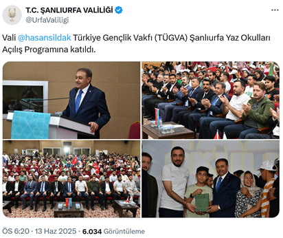 9. Şanlıurfa Valisi Hasan Şıldak AKP’li R.T. Erdoğan’ın oğlu Bilal Erdoğan’ın yüksek istişare kurulu üyesi olduğu TÜGVA’nın yaz okulları açılış törenine katılarak konuşma yaptı. Haber valiliğin resmi sosyal medya hesabında paylaşıldı. (13 Haziran)
