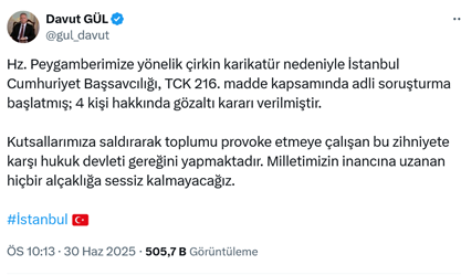 11. İslamcı terör örgütü İBDA-C ile bağlantılı Büyük Doğu Akıncılar Teşkilatı isimli grubun, Mizah dergisi Leman’da yayınlanan bir karikatürle ilgili “Hz. Muhammed tasviri” olduğu gerekçesiyle sosyal medyada linç kampanyası başlatarak dergi önüne çağrı yapmasının hemen ardından İstanbul Valisi Davut Gül sosyal medya hesabında yaptığı paylaşımda “Hz. Peygamberimize yönelik çirkin karikatür nedeniyle İstanbul Cumhuriyet Başsavcılığı, TCK 216. madde kapsamında adli soruşturma başlatmış; 4 kişi hakkında gözaltı kararı verilmiştir. Kutsallarımıza saldırarak toplumu provoke etmeye çalışan bu zihniyete karşı hukuk devleti gereğini yapmaktadır. Milletimizin inancına uzanan hiçbir alçaklığa sessiz kalmayacağız.” dedi. (30 Haziran)