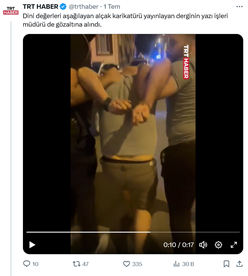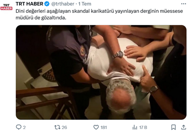 1. İslamcı terör örgütü İBDA-C ile bağlantılı Büyük Doğu Akıncılar Teşkilatı isimli grupla birlikte tarikat cemaat bağlantılı birçok gerici hesaptan, mizah dergisi Leman’da yayınlanan bir karikatürle ilgili “Hz. Muhammed tasviri” olduğu gerekçesiyle sosyal medyada linç kampanyası başlatılmasının ve dergi önüne çağrı yapmasının ve siyasi iktidarın yetkili ağızlarınca sosyal medyada rpvokasyonların devam ettirilmesinin ardından TRT, Leman Dergisi çalışanlarının ters kelepçe ile gözaltına alındığı videoları, “dini değerleri aşağılayan karikatürü paylşana hadsiz derginin grafikeri/müessese müdürü/yazı işleri müdürü de gözaltına alındı” ifadeleriyle resmi sosyal medya hesaplarında paylaştı. (30 Haziran)
