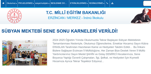 1. Milli Eğitim Bakanlığına bağlı Erzincan Merkez İnönü İlkokulu resmi internet sitesinde “Sübyan Mektebi sene sonu karneleri verildi!” başlıklı bir haber yer aldı. Haberde “024 2025 Öğretim Yılında Okulumuzda Tekrar Başlayan Sübyan Mektebinin Tamamlanması Nedeniyle, Okulumuz Öğrencilerine, Emektar Hocamız Sayın Kübra Eraslan Tarafından Hazırlanan Karne ve Hediyeleri Takdim Edildi... Bu İmkanı Bizlere Sağlayan Erzincan İl Müftülüğüne, Her Zaman Bize Destek Veren İl Müftü Yardımcılarımız Sayın Medet Şahin ve Gülay Demirci Hocalarımıza, Sene Boyunca Yaptığı Özverili Çalışmaları, İlgi, Şefkat, ve Hediyeleri İçin Kıymetli Hocamıza Ayrıca Tekrar Teşekkür Ediyoruz...” ifadeleri yer ladı. (1 Haziran)