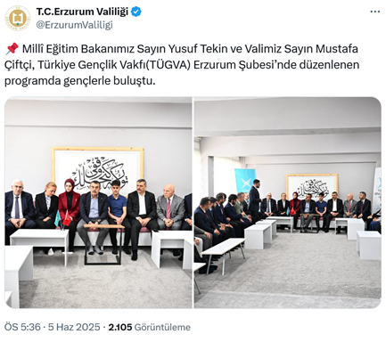 5. AKP’li Milli Eğitim Bakanı Yusuf Tekin Erzurum Valisi Mustafa Çiftçi ile birlikte AKP’li Cumhurbaşkanı R.T. Erdoğan’ın oğlu Bilal Erdoğan’ın yüksek istişare kurulu üyesi olduğu TÜGVA Erzurum Şubesi’nde düzenlenen programa katıldı. Program Valiliğin resmi sosyal medya hesabında paylaşıldı. (5 Haziran)
