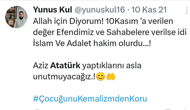 7. AKP’li Cumhurbaşkanı R.T. Erdoğan’ın oğlu Bilal Erdoğan’ın yöneticisi olduğu TÜGVA Bursa İl Teşkilatının 32 bin öğrenciyle yaptığı etkinliklere katılan TÜGVA Bursa İl Teşkilat Koordinatörü Yunus Kul’un Atatürk’e yönelik hakaretleri ortaya çıktı. AKP’li olduğunu da paylaşımlarında dile getiren Kul’un ve diğer TÜGVA temsilcilerinin Milli Eğitim Bakanlığı onayıyla devlet okullarındaki etkinliklerde öğrencilerin fotoğraflarını izinsiz bir şekilde çekti. Sınıflarda yapılan etkinliklere velilerin tepki gösterdiği belirtildi. Cumhuriyet Gazetesinden Ufuk Sepetci’nin haberine göre Yunus Kul’un önceki yıllarda 10 Kasım Atatürk’ü Anma Günü’nde sosyal medya hesabı üzerinden yaptığı bazı paylaşımlarda, “Elhamdülillah ne güzel bir gün ki yokluğuyla müşerref oluruz” ifadesini kullandığı belirtildi. Kul’un başka bir paylaşımında, “Aziz Atatürk yaptıklarını asla unutmayacağız” cümlesine “#çocuğunukemalizmdenkoru” etiketi eklediği, ayrıca “CHP vatan haini demektir, CHP=HDP demektir” ifadelerine yer verdiği aktarıldı. (9 Haziran)