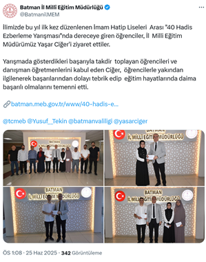 15. Miili Eğitim Bakanlığı tarafından düzenlenen “40 Hadis Etkinlikleri” kapsamında İmam Hatip Liseleri Arası “40 Hadis Ezberleme Yarışması”nda dereceye giren öğrenciler, Batman İl Milli Eğitim Müdürü Yaşar Ciğer'i ziyaret etti. Ziyarete Din Öğretimi Şube Müdürü Hacı Arslan da eşlik ederken, dereceye giren öğrencilere ödülleri İl Milli Eğitim Müdürü Yaşar Ciğer tarafından verildi. (25 Haziran)