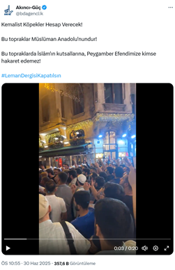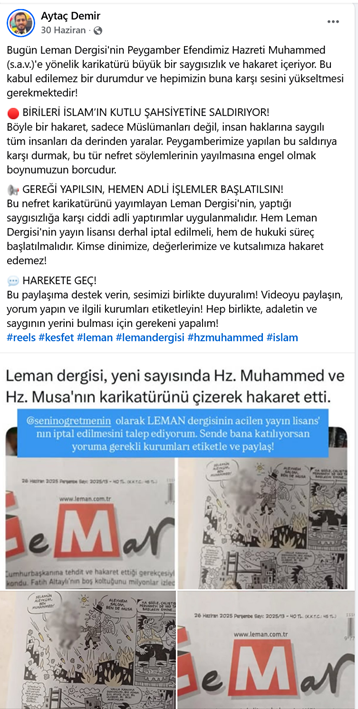 19. Mayıs ayında İstanbul Bağcılar'daki Arif Nihat Asya İlkokulu'nda “Çocukken şort giydir, mini etek giydir! Büyüdüğünde tesettüre girmesini bekle (ME)” başlığıyla sosyal medyada video paylaşan “sınıf öğretmeni” Aytaç Demir, İslamcı terör örgütü İBDA-C ile bağlantılı Büyük Doğu Akıncılar Teşkilatı isimli grubun, Mizah dergisi Leman’da yayınlanan bir karikatürle ilgili “Hz. Muhammed tasviri” olduğu gerekçesiyle sosyal medyada linç kampanyası başlatarak dergi önüne çağrı yapmasının hemen ardından “Bugün Leman Dergisi'nin Peygamber Efendimiz Hazreti Muhammed (s.a.v.)'e yönelik karikatürü büyük bir saygısızlık ve hakaret içeriyor. Bu kabul edilemez bir durumdur ve hepimizin buna karşı sesini yükseltmesi gerekmektedir! BİRİLERİ İSLAM’IN KUTLU ŞAHSİYETİNE SALDIRIYOR! Böyle bir hakaret, sadece Müslümanları değil, insan haklarına saygılı tüm insanları da derinden yaralar. Peygamberimize yapılan bu saldırıya karşı durmak, bu tür nefret söylemlerinin yayılmasına engel olmak boynumuzun borcudur. GEREĞİ YAPILSIN, HEMEN ADLİ İŞLEMLER BAŞLATILSIN! Bu nefret karikatürünü yayımlayan Leman Dergisi'nin, yaptığı saygısızlığa karşı ciddi adli yaptırımlar uygulanmalıdır. Hem Leman Dergisi'nin yayın lisansı derhal iptal edilmeli, hem de hukuki süreç başlatılmalıdır. Kimse dinimize, değerlerimize ve kutsalımıza hakaret edemez! HAREKETE GEÇ! Bu paylaşıma destek verin, sesimizi birlikte duyuralım! Videoyu paylaşın, yorum yapın ve ilgili kurumları etiketleyin! Hep birlikte, adaletin ve saygının yerini bulması için gerekeni yapalım!” ifadeleriyle paylşaım yaptı. Demir, halen öğretmen olarak MEB bünyesinde çalışıyor. (30 Haziran)