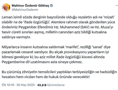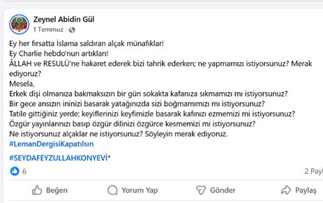 1. İslamcı terör örgütü İBDA-C ile bağlantılı Büyük Doğu Akıncılar Teşkilatı isimli grubun, Mizah dergisi Leman’da yayınlanan bir karikatürle ilgili “Hz. Muhammed tasviri” olduğu gerekçesiyle sosyal medyada linç kampanyası başlatarak dergi önüne çağrı yapmasının hemen ardından AKP’li Aile ve Sosyal Hizmetler Bakanı Mahinur Özdemir Göktaş sosyal medya hesabında yaptığı paylaşımda “Leman isimli sözde derginin başrolünde olduğu rezaletin adı ne ‘mizah’ olabilir ne de ‘ifade özgürlüğü’. Alemlere rahmet olarak gönderilen yüce önderimiz Peygamber Efendimiz Hz. Muhammed (SAV) ve Hz. Musa’yı tasvir cüreti sınırları aşmış, milletin canından aziz bildiği kutsalına saldırıya varmıştır. Milyarlarca insanın kutsalına saldırmak ‘marifet’, rezilliği ‘sanat’ diye pazarlamak cesaret sanılıyor. Bu alçak provokasyonu yapanların iyi bilmesi gerekiyor ki; bu aziz millet ifade özgürlüğü kisvesi altında Peygamberine dil uzatılmasını asla sineye çekmez. Bu çürümüş zihniyetin temsilcileri yaptıkları terbiyesizliğin ve hadsizliğin hesabını hem vicdan hem de hukuk önünde verecektir!” dedi. (30 Haziran)