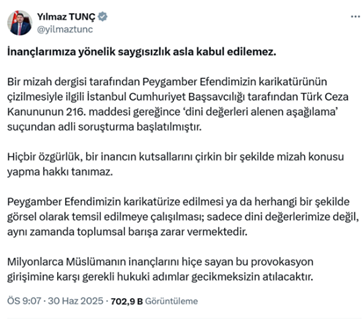 1. İslamcı terör örgütü İBDA-C ile bağlantılı Büyük Doğu Akıncılar Teşkilatı isimli grubun, Mizah dergisi Leman’da yayınlanan bir karikatürle ilgili “Hz. Muhammed tasviri” olduğu gerekçesiyle sosyal medyada linç kampanyası başlatarak dergi önüne çağrı yapmasının ardından AKP’li Adalet Bakanı Yılmaz Tunç sosyal medya hesabından yaptığı paylaşımda “İnançlarımıza yönelik saygısızlık asla kabul edilemez. Bir mizah dergisi tarafından Peygamber Efendimizin karikatürünün çizilmesiyle ilgili İstanbul Cumhuriyet Başsavcılığı tarafından Türk Ceza Kanununun 216. maddesi gereğince ‘dini değerleri alenen aşağılama’ suçundan adli soruşturma başlatılmıştır. Hiçbir özgürlük, bir inancın kutsallarını çirkin bir şekilde mizah konusu yapma hakkı tanımaz. Peygamber Efendimizin karikatürize edilmesi ya da herhangi bir şekilde görsel olarak temsil edilmeye çalışılması; sadece dini değerlerimize değil, aynı zamanda toplumsal barışa zarar vermektedir. Milyonlarca Müslümanın inançlarını hiçe sayan bu provokasyon girişimine karşı gerekli hukuki adımlar gecikmeksizin atılacaktır.” dedi. (30 Haziran)