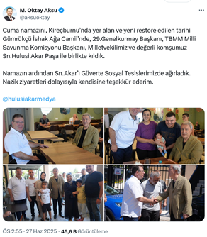 3. CHP’li Sarıyer Belediye Başkanı Oktay Aksu, sosyal medya hesabında yaptığı paylaşımda “Cuma namazını, Kireçburnu’nda yer alan ve yeni restore edilen tarihi Gümrükçü İshak Ağa Camii’nde, 29. Genelkurmay Başkanı, TBMM Milli Savunma Komisyonu Başkanı, Milletvekilimiz ve değerli komşumuz Sn. Hulusi Akar Paşa ile birlikte kıldık. Namazın ardından Sn. Akar’ı Güverte Sosyal Tesislerimizde ağırladık. Nazik ziyaretleri dolayısıyla kendisine teşekkür ederim.” ifadelerini kullandı. (27 Haziran)