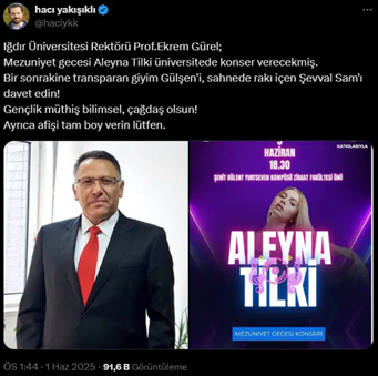 1. Iğdır Üniversitesi, mezuniyet töreni kapsamında yapılacak Aleyna Tilki konserini iptal etti. Resmi açıklamada “yağış” gerekçe gösterilirken, sosyal medyada AKP’li isimler ve bazı grupların Tilki’yi hedef alıp “iptal çağrısı” yaptığı görüldü. (2 Haziran)