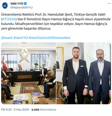 2. Van Yüzüncü Yıl Üniversitesi Rektörü Hamdullah Şevli, AKP’li Cumhurbaşkanı R.T. Erdoğan’ınoğlu Bilal Erdoğan’ın yüksek istişare kurulu üyesi olduğu TÜGVA’nın Van İl Temsilcisi Hamza Sığınç’a “hayırlı olsun” ziyaretinde bulundu. Ziyaret, üniversitenin resmi sosyal medya hesabında paylaşıldı. (5 Haziran)