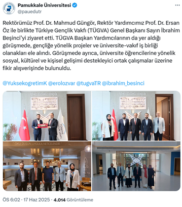 3. Pamukkale Üniversitesi Rektörü Mahmud Güngör, Rektör Yardımcısı Ersan Öz ile birlikte AKP’li Cumhurbaşkanı R.T. Erdoğan’ınoğlu Bilal Erdoğan’ın yüksek istişare kurulu üyesi olduğu TÜGVA’nın Genel Başkanı İbrahim Beşinci’yi ziyaret etti. Ziyaret, üniversitenin resmi sosyal medya hesabında paylaşıldı. (17 Haziran)