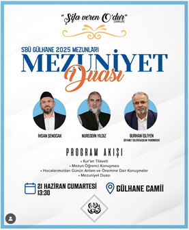 5. Sağlık Bilimleri Üniversitesi Gülhane Tıp Fakültesi mezuniyet programı “mezuniyet duası” adı altında Gülhane Camisinde yapıldı. Diyanet İşleri Başkan Yardımcısı Burhan İşliyen ile çocuk yaşta evliliğin meşru olduğunu söyleyen gerici Nurettin Yıldız ve Cumhuriyet düşmanı İhsan Şenocak’ın da katıldığı törende, mezun hekimlere dini nasihatler verildi. (26 Haziran)