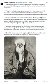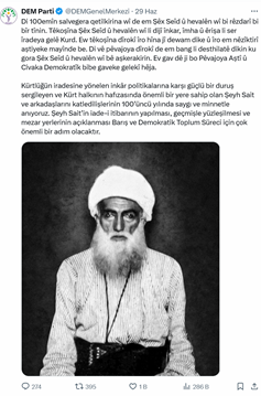 8. DEM Parti, Cumhuriyet'e karşı şeriat isteğiyle isyan başlatmasının ardından 1925'te idam edilen Şeyh Sait için iade-i itibar istedi. DEM Parti açıklamasında, idam edilişinin 100'üncü yıldönümü olan (29 Haziran) hilafet yanlısı gerici Şeyh Sait'in iade-i itibarının "süreç" için çok önemli bir adım olacağı vurgulandı. Açıklamada “Kürtlüğün iradesine yönelen inkâr politikalarına karşı güçlü bir duruş sergileyen ve Kürt halkının hafızasında önemli bir yere sahip olan Şeyh Sait ve arkadaşlarını katledilişlerinin 100’üncü yılında saygı ve minnetle anıyoruz. Şeyh Sait’in iade-i itibarının yapılması, geçmişle yüzleşilmesi ve mezar yerlerinin açıklanması Barış ve Demokratik Toplum Süreci için çok önemli bir adım olacaktır.” dendi. (29 Haziran)