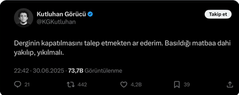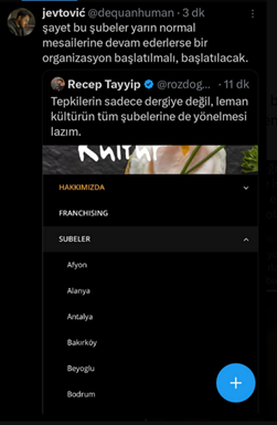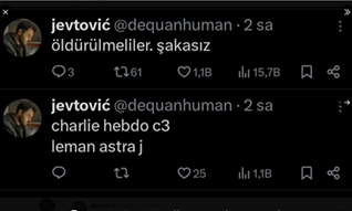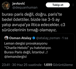 10. İslamcı terör örgütü İBDA-C ile bağlantılı Büyük Doğu Akıncılar Teşkilatı isimli grup ile birlikte tarikat cemaat uzantılı yapıların ve AKP’li çeşitli bakanların, Mizah dergisi Leman’da yayınlanan bir karikatürle ilgili “Hz. Muhammed tasviri” olduğu gerekçesiyle sosyal medyada linç kampanyası başlatmalarının ardından birçok gerici hesaptan Cumhuriyet düşmanı linç paylaşımları yapıldı. Hasan Kayışoğlu isimli bir şahıs Paris’te cihatçıların saldırarak katliam yaptığı mizah dergisi Charlie Hebdo’ya “Hz. Muhammed peygamberin intikamını aldık” yazılı saldırı görüntülerini “tarih tekerrürden ibaret” ifadesiyle paylaştı. Zeynel Abidin Gül isimli bir şahıs “Ey her fırsatta İslama saldıran alçak münafıklar! Ey Charlie hebdo'nun artıkları! ÂLLAH ve RESULÜ'ne hakaret ederek bizi tahrik ederken; ne yapmamızı istiyorsunuz? Merak ediyoruz? Mesela, Erkek dişi olmanıza bakmaksızın bir gün sokakta kafanıza sıkmamızı mı istiyorsunuz? Bir gece ansızın ininizi basarak yatağınızda sizi boğmamımızı mı istiyorsunuz? Tatile gittiğiniz yerde; keyiflerinizi keyfimizle basarak kafınızı ezmemizi mi istiyorsunuz? Özgür yayınlarınızı basıp özgür dilinizi özgürce kesmemizi mi istiyorsunuz? Ne istiyorsunuz alçaklar ne istiyorsunuz? Söyleyin merak ediyoruz.” Sözlerini paylaşırken, @hanefininja isimli bir kullanıcı 2 Temmuz 1993’teki Sivas katliamı görüntülerini paylaşarak “Ateşe verin” ifadelerini kullandı. Esat Eşrefoğlu isimli bir şahıs “O bina yanacak” ifadeleriyle Leman Dergisi önündeki gerici güruhun fotoğrafını paylaştı. Kocaeli Üniversitesi Siyasi Tarih Bölümü’yle bağlantılı, SETA Dış Politika Direktörlüğünde çalışan, “Suriye Gündemi” isimli internet sitesinde baş editörlük yapan, siyasi iktidara yakın Sabah gazetesinde yazılar yazan Kutluhan Görücü isimli şahıs da “Derginin kapatılmasını talep etmekten ar ederim. Basıldığı matbaa dahi yakılıp yıkılmalı” sözlerini paylaştı. (30 Haziran)