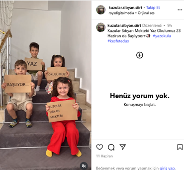 3. Siirt’te “Kuzular Sıbyan Mektebi” isimli bir oluşum, sosyal medya hesabında sıbyan mektebi kayıtlarının başladığını “Kuzular Sıbyan Mektebi Yaz Okulumuz 23 Haziran da Başlıyoorr” sözleri ve çocukların yer aldığı bir video ile duyurdu. (11 Haziran)