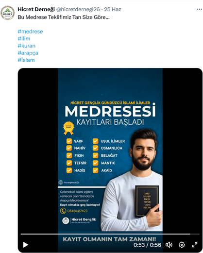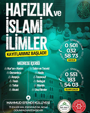 5. İsmailağa cemaatiyle bağlantılı Hicret Derneği, sosyal medya hesabında “Hafızlık ve İslami ilimler kayıtlarımız başlamıştır. Hafızlık yapmak isteyen ve İslami ilimler okumak isteyen tüm kardeşlerimizi medresemize bekliyoruz.” ifadeleriyle duyuru paylaştı. Paylaşılan görselde, Eskişehir Odunpazarı Mahmudiye Külliyesi adresi verildi. (18 Haziran)