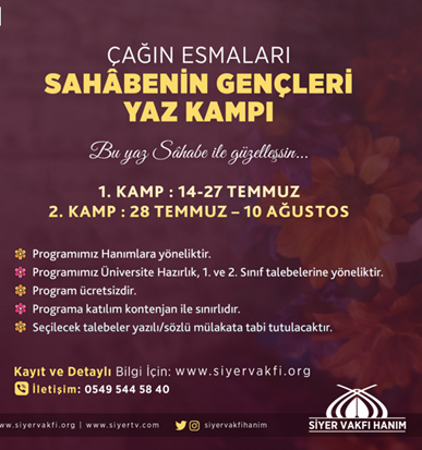 2. Türkiye’de Hizbullah adıyla faaliyet yürüten islamcı terör örgütüyle bağlantılı Siyer Vakfı, 9, 10, 11 ve 12. sınıf kız öğrenciler için “Tamir’Hane’ Lise 2025 Yaz Kampı” düzenlediğini duyurdu. Yatılı kampın 29 Haziran – 13 Temmuz tarihleri arasında İstanbul’da düzenleneceği belirtildi. (8 Haziran)