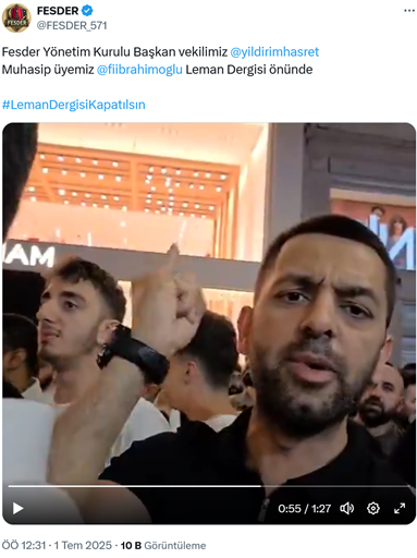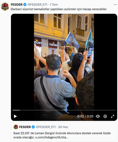 12. İslamcı terör örgütü İBDA-C ile bağlantılı Büyük Doğu Akıncılar Teşkilatı isimli grubun, Mizah dergisi Leman’da yayınlanan bir karikatürle ilgili “Hz. Muhammed tasviri” olduğu gerekçesiyle sosyal medyada linç kampanyası başlatarak dergi önüne çağrı yapmasıyla, bölgeye gelen gerici gruplardan, FESDER de yönetim kurulu üyesi Fırat İsmail İbrahimoğlu’nun konuşmasını sosyal medya hesaplarında paylaştı. İbrahimoğlu, “Peygamber efendimize karşı haddini aşan aşağılık kafirlere tepkimizi göstermek için Leman Dergisinin önündeyiz. Müslümanlar asla zayıf değildir. Haddinizi bileceksiniz. Peygamber efendimize hakaret edilen yerde hiçbir kafirin canı güvende değildir.” Dedi. Gerici güruh “cenk, cihad, şehadet”, “dişe diş, kana kan intikam intikam”, “kemalist köpekler hesap verecek.” sloganları atarak tekbirler getirdi. Söz konusu gerici derneğin internet sitesinde “FESDER’in manevi ilham kaynaklarından biri de, ömrünü İslam davasına ve tarih şuurunun inşasına adamış merhum Kadir Mısıroğlu’dur. Onun fikirleri, mücadele ruhu ve duruşu, derneğimizin yol haritasında önemli bir yere sahiptir. Bizler de onun bıraktığı fikrî mirası yaşatmayı ve gelecek nesillere aktarmayı bir vazife olarak görmekteyiz.” ifadeleri yer alıyor. (30 Haziran)