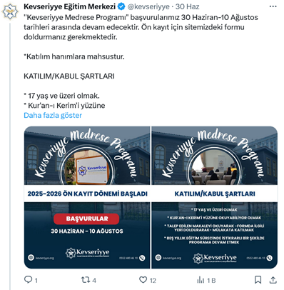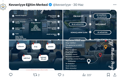 13. İskenderpaşa cemaatiyle bağlantılı Kevseriyye Eğitim Merkezi, sosyal medya hesabında “'Kevseriyye Medrese Programı” duyurusu yayınladı. Duyuruda “başvurularımız 30 Haziran-10 Ağustos tarihleri arasında devam edecektir. Ön kayıt için sitemizdeki formu doldurmanız gerekmektedir. Katılım hanımlara mahsustur.” Ifadeleri ile medrese programı yer aldı. (30 Haziran)
