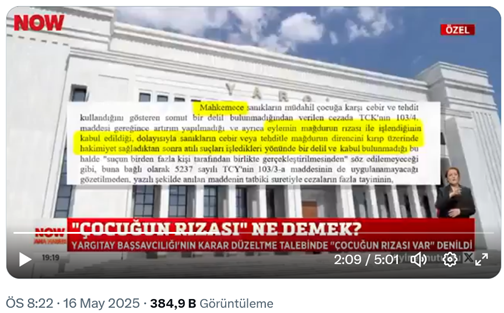 - AKP Sakarya Milletvekili Ali İnci’nin, Sakarya'da 14 yaşındaki kız çocuğuna cinsel istismarda bulunmak suçundan 26 yıl 6 ay 22 gün hapis cezasına çarptırılan, kardeşi Yusuf İnci ile ilgili Yargıtay Cumhuriyet Başsavcılığı’nın, 2022 ve 2023 yıllarında üç kez reddettiği karar düzeltme talebini 4'üncü başvuruda, mahkumiyet kararının kaldırılmasını ve kararın bozulmasını isteyerek kabul ettiği ortaya çıktı. NOW TV haber spikeri Selçuk Tepeli’nin programındaki haberde “Yargıtay Cumhuriyet Başsavcılığı kararın bozulması için olağanüstü kanun yoluna başvurdu. Başsavcılık gerekçesinde, “mağdurenin rızası var' dedi.” bilgileri yer aldı. Yargıtay Cumhuriyet Başsavcılığı’nın yazısında “Mahkemece (…) eylemin madurenin rızası ile işlendiğinin kabul dildiği, dolayısıyla, sanıkların cebir veya tehditle mağdurun direncini kırıp üzerinde hakimiyet sağladıktan sonra atılı suçları işledikleri yönünde bir delil veya Kabul bulunmadığı” ifadeleri yer aldı. (16 Mayıs)