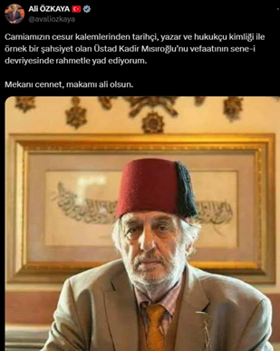 4. AKP Afyonkarahisar Milletvekili Ali Özkaya, laik Cumhuriyet ve Atatürk düşmanlığıyla bilinen Kadir Mısıroğlu’nu ölüm yıl dönümünde yayımladığı taziye mesajıyla andı. Özkaya mesajda “Camiamızın cesur kalemlerinden tarihçi, yazar ve hukukçu kimliği ile örnek bir şahsiyet olan Üstad Kadir Mısıroğlu’nu vefatının sene-i devriyesinde rahmetle yâd ediyorum. Mekânı cennet, makamı ali olsun.” ifadelerine yer vedi. (6 Mayıs)