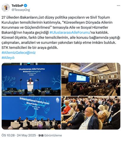 15. Türkiye’de Hizbullah adıyla faaliyet yürüten islamcı terör örgütüyle bağlantılı olan Tesettür Seferberliği ve Erdemli Kadınlar Derneği (TESSEP), Aile ve Toplum Hizmetleri Genel Müdürlüğü, AB ve Dış İlişkiler Dairesi Başkanlığı ile Aile Enstitüsü Genel Müdürlüğü tarafından ortaklaşa düzenlenen “Küreselleşen Dünyada Ailenin Korunması ve Güçlendirilmesi adı altındaki “Uluslararası Aile Forumu”na katıldı. (24 Mayıs)
