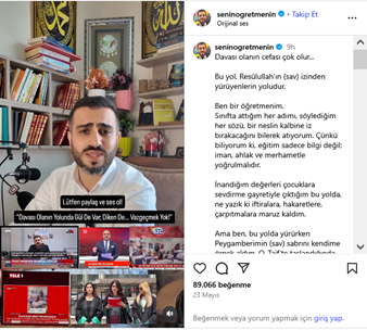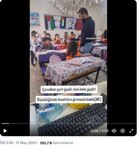 7. İstanbul Bağcılar'daki Arif Nihat Asya İlkokulu'nda sınıf öğretmeni olan Aytaç Demir “Çocukken şort giydir, mini etek giydir! Büyüdüğünde tesettüre girmesini bekle (ME)” başlığıyla sosyal medyada paylaştığı videoda öğrencilerin kıyafetlerini hedef alarak şort giyilmesini “edepsizlik” olarak nitelendirdi. Söz konusu öğretmen, öğrencilerine “Müslüman şort giyer mi, biz buralarımızı gösterir miyiz insanlara? İnsanların ne düşündüğü mü önemli, yoksa Allahın bizden ne istediği mi? Allahın bizden ne istediği önemli. Allah bizden bir şey istiyorsa, Allah bir şeyi ayıp görüyorsa insanların bu konuda ne düşündüğünün önemi yoktur. Biz çocuğuz giyinsek ne olur? Şimdi giyinirsen, büyüdüğünde de giyinirsin, değil mi? İnsan küçükken neyse büyüdüğünde de ona yakın bir şey olur. Edep her zaman küçüklükte yani bu yaşlarda başlar. Müslümanın çocuğu her zaman akıllı ve edeplidir. Siz müslümanın çocuğu değil misiniz? Müslüman mısınız? (evet diyen çocuklara) Evet değil. Ne diyorduk? (Çocuklar: elhamdülillah) Evet. Çünkü müslüman olmak şükür gerektirir. Müslüman olmak herkese nasip oluyor mu? Hayır. Herkes değil. Biz şükürler olsun ki müslümanız. Anamız, babamız, kardeşlerimiz müslüman. Rabbimiz bizi böyle yaratmış. O zaman ne diyeceğiz? Evet değil. (Çocuklar: elhamdülillah)” ifadelerini kullandı. Demir’in sosyal medya platform Instagram hesabında benzer videolar arasında “bütün alimler ittifak etmiştir ki, depremlerin en büyük sebebi şehirde olan fuhuş, ahlaksızlık, birçok daha farklı sebepler var ama en büyüğü fuhuş ve ahlaksızlık.” ifadelerinin yer aldığı paylaşımı da yer alıyor. (17 Mayıs)
