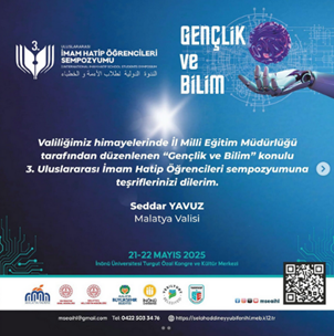 12. Malatya İl Milli Eğitim Müdürlüğü, Malatya Valiliği ve Selahaddin Eyyubi Anadolu İmam Hatip Lisesi tarafından İnönü Üniversitesi Turgut Özal Kongre ve Kültür Merkezinde “3. Uluslararası İmam Hatip Öğrencileri Sempozyumu” düzenlendi. Kuran tilaveti ile başlayan programda konuşan İl Milli Eğitim Müdürü Behçet Bakır, “Günümüzde, gençliğin akıl ve ruh bütünlüğü içerisinde yetişmesi; hem toplumumuz hem de insanlığın geleceği açısından hayati bir önem arz etmektedir. Bu okullarımız, kuruluş felsefelerinden bugüne kadar; ilim ile irfanı, maneviyat ile aklıselimi bir arada yürütmenin gayreti içerisinde olmuşlardır. İslami ilimler ile pozitif ilimlerin ayrılmaz bir bütün olarak ele alınması, bizlere yalnızca teknik bilgi değil, aynı zamanda hikmetli bir bakış açısı kazandırır. Bu bütüncül yaklaşım, ülkemizin son yıllarda ortaya koyduğu büyük atılım ve Türkiye Yüzyılı Maarif Modeli ile de birebir örtüşmektedir. Maarif Modeli; evrensel bilgi ile milli ve manevi değerlerimizi buluşturan, fikri hür, vicdanı hür, irfanı hür nesiller yetiştirme vizyonunun somutlaşmış halidir.” dedi. Sempozyuma, Bakır’ın yanı sıra Eğitime Destek Platformu Başkanı Hüseyin Söylemez, Vali Yardımcısı Reşit Reşat Özdemir, Milli Eğitim Bakanlığı Din Öğretimi Genel Müdürlüğü Daire Başkanı İhsan Erkul, katıldı. Erkul yaptığı konuşmada “İmam hatip öğrencileri geleceğin dünyasını inşa edecekler. Gençlik ve bilim üzerine burada düşüncelerini paylaşacaklar, eleştirecekler ve krizler içinde olan dünyaya 'Benim de bir sözüm var' diyecekler. İmam hatip okullarının iki kanadı vardır: Bir yanda dini ilimler, diğer yanda fen ve sosyal bilimler. Kitabın ayetleri ve kâinatın ayetleri birlikte öğretiliyor. Bu model Türkiye'ye özgüdür ve artık uluslararası arenada tanıtılıyor. Bu model artık Türkiye'den yurt dışına ihraç ediliyor. Kur'an dersi ile başlayan gün kimya laboratuvarı ile devam ediyor, ardından İngilizce ve Arapça dersleri geliyor. İşte gelecek nesli bu vizyonla yetiştiriyoruz.” dedi. (21 Mayıs)