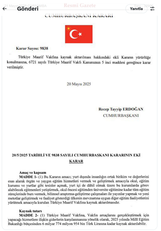13. AKP'li Cumhurbaşkanı R.T. Erdoğan'ın imzasıyla yayımlanan Cumhurbaşkanı Kararı ile Türkiye Maarif Vakfı'na 2025 yılı için 6 milyar 774 milyon 954 bin TL'ye kadar kaynak aktarılmasına karar verildi. “Gölge Bakanlık” olarak adlandırılan ve 15 Temmuz 2016’daki darbe girişiminin ardından “yurtdışındaki FETÖ okullarını devralmak” için kurulan vakfa 2025 yılında yurt dışında örgün ve yaygın eğitim hizmetleri vermek ve geliştirmek amacıyla okul, eğitim kurumu ve yurtlar gibi tesisler açmak, yurt içi de dahil olmak üzere bu kurumlarda görev alabilecek eğitmenleri yetiştirmek, okul öncesi eğitimden üniversite eğitimine kadar tüm eğitim süreçlerinde burs vermek, bilimsel araştırma-geliştirme çalışmaları ile yayınlar yapmak ve yeni metotlar geliştirmek ve faaliyet gösterdiği ülkenin mevzuatına uygun diğer eğitim faaliyetlerini yürütmek amacıyla aktarılacak para Milli Eğitim Bakanlığı bütçesinden çıkacak. (21 Mayıs)