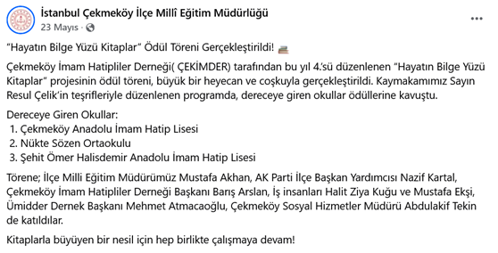 16. İstanbul Çekmeköy İlçe Milli Eğitim Müdürü Mustafa Akhan, Çekmeköy İmam Hatipliler Derneği (Çekimder) tarafından düzenlenen “Hayatın Bilge Yüzü Kitaplar” adı altında düzenlenen “kitap okuma yarışması” ödül töreni’ne Çekmeköy Kaymakamı Resul Çelik, Çekmeköy İlçe Sosyal Hizmet Merkezi Müdürü Abdülakif Tekin, AKP İlçe Başkan Yardımcısı Nazif Kartal ile birlikte katıldı. (23 Mayıs)