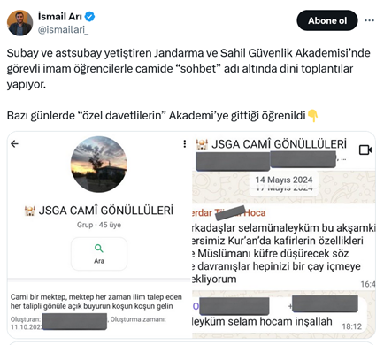 2. Menzil Cemaati’nin jandarmada örgütlendiği iddialarıyla gündem olan Jandarma Komutanlığı, Jandarma ve Sahil Güvenlik Akademisi’nin (JSGA) bulunduğu yerleşkedeki camide görevli bir imamın askeri öğrencilerle camide toplantılar yaptığı ortaya çıktı. BirGün Gazetesinden İsmail Arı’nın haberine göre “JSGA Camii Gönüllüleri” isimli bir WhatsApp grubu da kuruldu. Grupta imam Adem Serdar T. ile askeri öğrenciler bulunuyor. Grupta yapılan yazışmalarda, imam eşliğinde hafta sonları Çankaya İlçe Müftülüğü’nün Gençlik Merkezi’nde buluşmalar organize edildiği görüldü. Gruptaki bir yazışmada bir askeri öğrencinin “Hocam bu akşam sohbet var mı?” diye sorduğu imam Adem Serdar T.'nin “Evet var, yatsı namazından sonra” yanıtı yer aldı. Grupta imam Adem Serdar T.’nin “Arkadaşlar bu akşamki dersimiz Kuran'da kâfirlerin özellikleri ve Müslümanı küfre düşürecek söz ve davranışlar, hepinizi bir çay içmeye bekliyorum” ifadeleri ile Doğukan O. isimli bir şahsın “Selamünaleyküm arkadaşlar bildiğiniz üzere dünden itibaren Pençe Kilit Operasyonu bölgesinde şehit olan 12 kardeşimiz ve tüm şehitlerimiz için hatim okuyorsunuz. Okuduğunuz bu hatim ve başka gelen diğer hatimlerin duası için özel bir program hazırlıyoruz. Program Cumartesi sabah namazında (saat 07.00-09.00 arası) ilçe müftümüz ve özel davetli hocaların katılımıyla kuran ziyafeti tesbihat dua ve çorba ikramı şeklinde icra edilecek sizleri bekliyoruz” ifadelerini yazdığı görüldü. (17 Mayıs)