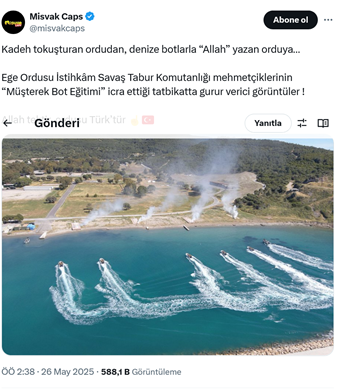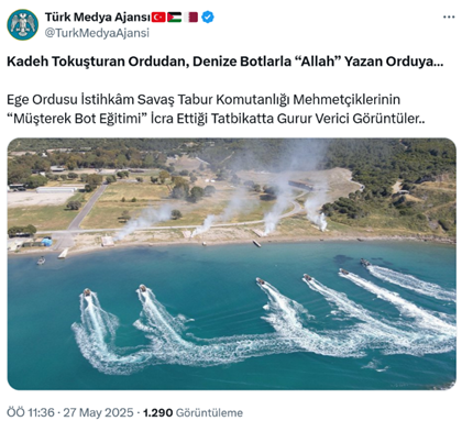 4. Ege Ordusu İstihkâm Savaş Tabur Komutanlığı ve 1'inci Amfibi Deniz Piyade Tugay Komutanlığı unsurları, Menteş bölgesinde müşterek bot eğitimi yapıldı. Eğitim sırasında botlarla denizde Allah yazıldı. Birçok gerici sosyal medya hesabı görüntüleri “Kadeh tokuşturan ordudan, denize botlarla “Allah” yazan orduya… Ege Ordusu İstihkâm Savaş Tabur Komutanlığı mehmetçiklerinin “Müşterek Bot Eğitimi” icra ettiği tatbikatta gurur verici görüntüler!” ifadeleriyle paylaştı. (25 Mayıs)