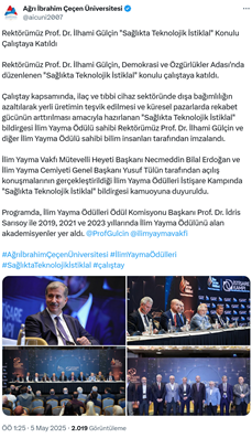 1. AKP’li Cumhurbaşkanı R.T. Erdoğan’ın oğlu Bilal Erdoğan’ın mütevelli heyeti başkanı olduğu İlim Yayma Cemiyeti tarafından düzenlenen “Sağlıkta Teknolojik İstiklal Çalıştayı” Kültür ve Turizm Bakanlığı Kültür Varlıkları ve Müzeler Müdürlüğü’ne tahsis edilmiş olan Yassıada’da yapıldı. Çalıştay’da “İlim Yayma Ödülü” verilen “bilim insanları” tarafından “Sağlıkta Teknolojik İstiklal” bildirgesi imzalandı. Ağrı İbrahim Çeçen Üniversitesi (AİÇÜ) Rektörü İlhami Gülçin, İlim Yayma Cemiyeti tarafından Yassıada’da düzenlenen "Sağlıkta Teknolojik İstiklal" çalıştayına katıldı. İilim Yayma Ödülü alarak bildirgeyi imzalayan isimler şöyle: Ağrı İbrahim Çeçen Üniversitesi (AİÇÜ) Rektörü İlhami Gülçin, Fikrettin Şahin, Mehmet Zahmakıran, İlyas Kemaloğlu, Zekai Şen, Mustafa Soylak, İbrahim Akduman, Zekeriya Kurşun ve Hümeyra Özturan. Bildirgede önerilen politika stratejileri arasında Sağlık Sanayi Başkanlığı'nın kurulması, AR-GE ve inovasyonun güçlendirilmesi, yerli üretim oranlarının artırılması gibi maddeler yer alırken, haber Ağrı İbrahim Çeçen Üniversitesi resmi sosyal medya hesaplarında da paylaşıldı. (5 Mayıs)