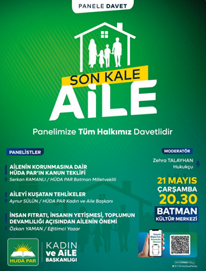 28. HÜDA PAR Medya Birimi Başkan Yardımcısı Şehymus Tanrıkulu Şanlıurfa’da Meclis'e sunulan "Ailenin Korunması ve Sapkınlığın Suç Sayılması" yasa tasarısı hakkındaki sorulara yanıt verdi. Tanrıkulu “Sadece 2 çocuğa 1500 lira, 3 çocuğa 5000 lira vermekle aile muhafaza edilmez, insanların çocuk yapması teşvik edilmez. Her şeyden önce bir zihniyet değişimi ve dönüşümüne ihtiyacımız var. İstanbul Sözleşmesi'nin tahribatlarını hayatın her alanında ortadan kaldırmak gerekiyor. 6284 sayılı yasayı revize etmek gerekiyor. Süresiz nafaka, 'kadının beyanı esastır' gibi temel hukuk ilkelerine aykırı ve çelişkili düzenlemeleri ortadan kaldırmamız lazım. Medeniyet değerlerimize, örf ve kültürümüze, geleneklerimize uygun yasal düzenlemeler yapılması gerekiyor. Yine çocuklarımızın ilkokuldan itibaren ailenin önemli, korunaklı ve mukaddes bir kurum olduğuna dair bir eğitim süzgecinden geçirilmesi gerekiyor.” dedi. (20 Mayıs)