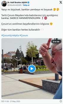 3. AKP'li Çorum Belediye Başkanı Halil İbrahim Aşgın, Çorum Meydanındaki banklara cinsiyet ataması yaptı. Sosyal medya hesabından son uygulamasını çektiği bir video ile X hesabından paylaşan Aşgın, "Tarihi Çorum Meydanı'nda kadınlarımız için ayırdığımız banklar, sadece hanımefendilerin " ifadelerini kullanarak belirli bir bölgedeki bankların sadece kadınlara ayrıldığını açıkladı. Çorum meydanına bankların cinsiyet ataması ile ilgili olarak bir de uyarı levhası asıldığı görüldü. Levhada “Bu banklar hanımefendilere ayrılmıştır” ifadeleri yer alıyor. (22 Mayıs)