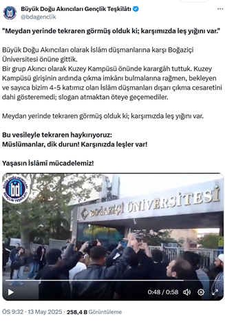 4. Boğaziçi Üniversitesi İslam Araştırmaları Kulübü’nün (BİSAK) kadına yönelik şiddeti ve çocuk evliliklerini savunan Sosyal Doku Vakfı Başkanı gerici Nurettin Yıldız ile yapacağı etkinliği protesto etmek amacıyla toplanan öğrenciler kampüslerinde ablukaya alındı. Öğrencilerle birlikte T24 muhabiri Can Öztürk de işkenceyle gözaltına alındı. Gözaltına alınan 97 Boğaziçi Üniversitesi öğrencisinden 6'sı tutuklanarak cezaevine gönderildi. Öğrencilerin, BİSAK’ın etkinliğini protesto etmek için toplanmaya çağırmasının ardından etkinliğin ertelenmesinin duyurulmasından kısa süre sonra islamcı terör örgütü İBDA-C ile bağlantılı Büyük Doğu Akıncıları Gençlik Teşkilatı, X hesaplarından etkinliğe katılım göstereceklerini duyurarak, üniversitenin Güney ve Kuzey Kampüs kapıları önünde eylem düzenleyerek şeriat çağrısı yaptı. Polisin gruba müdahale etmediği görüldü. Dernek, sosyal medya hesapları üzerinden yaptığı paylaşımlarda Boğaziçi Üniversitesi öğrencilerini hedef alarak "leş yığını" ifadelerini kullandı. Paylaşımlarda, “Kan Can Pahası Şeriat Kavgası” başlığı altında, “İslâm için feda-i can eden şehirlerimizin bize vatan kıldığı bu topraklarda Şeriât karşıtlığına geçit vermeyeceğiz” ifadeleri yer aldı. (13 Mayıs)
