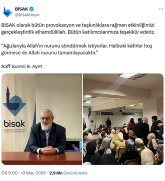 5. Boğaziçi Üniversitesi İslam Araştırmaları Kulübü’nün (BİSAK) kadına yönelik şiddeti ve çocuk evliliklerini savunan Sosyal Doku Vakfı Başkanı gerici Nurettin Yıldız ile üniversite kampüsünde yaptığı etkinliği “BİSAK olarak bütün provokasyon ve taşkınlıklara rağmen etkinliğimizi gerçekleştirdik elhamdülillah.” ifadeleriyle paylaştı. (13 Mayıs)