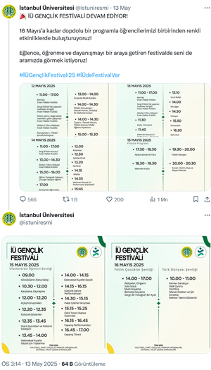 6. İstanbul Üniversitesi, resmi sosyal medya hesaplarından düzenleyeceği Gençlik Festivali'nin programını yayınladı. Filistin başlığıyla düzenlenen etkinliklerin “Kuran-ı Kerim, dua ve akşam namazıyla sona ereceği görüldü. (13 Mayıs)