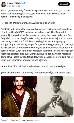 8. Siyasi iktidar yanlısı Cumhuriyet, laiklik ve Atatürk düşmanı Furkan Bölükbaşı sosyal medya hesabından yine provokasyona imza attı. Bölükbaşı paylaşımında, “Soldaki, Deniz Gezmiş. Üniversite işgal etti, Rektörlük bastı, askerden kaçtı, silahlı terör örgütü kurdu, polis yaraladı, banka soydu, adam kaçırdı. Tam bir suç makinesiydi. Her sene CHP’liler tarafından büyük bir gururla anılıyor. Sağdaki, Kadir Mısıroğlu. Lozan Anlaşması’nın hezimet olduğunu ortaya çıkardı, hakkında 5816’dan haksız yere dava açıldı. Harf Devrimini eleştirdiği için yedi yıl hapis cezası aldı. Uzun yıllar cezaevinde yattı. Sebil Dergisi’ni kurdu. Bu dergide yakın tarih yalanlarını anlattığı için hakkında davalar açıldı. Erbakan’la birlikte MSP’de görev aldı. Recep Tayyip Erdoğan, Alparslan Türkeş, Turgut Özal, Nihal Atsız gibi pek çok siyasetçi ile ilişkisi oldu. Darbeden sonra yurtdışına çıkmak zorunda kaldı. 1983’te darbeci Kenan Evren tarafından Kemalizm yalanlarını ortaya çıkardığı için vatandaşlığı iptal edildi. 1991 yılında Türkiye’ye döndü. Yunan Mezalimi başta olmak üzere 60’dan fazla kitap, yüzlerce video neşretti. Türk milleti yakın tarih yalanlarını onun sayesinde öğrendi. AK Partililer ölüm yıldönümünde bile onu anmaktan imtina ediyor. Şimdi anladınız mı? Kültür savaşı nasıl kaybedilir? İşte tam olarak böyle.” ifadelerine yer verdi. (7 Mayıs)