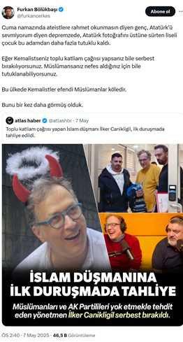 9. Siyasi iktidar yanlısı Cumhuriyet, laiklik ve Atatürk düşmanı Furkan Bölükbaşı sosyal medya hesabından yine provokasyona imza attı. Bölükbaşı paylaşımında, 19 Mart eylemleri sırasında sosyal medya paylaşımı nedeniyle tutuklanan İlker Canikligil’in serbest bırakılmasıyla ilgili “Cuma namazında ateistlere rahmet okunmasın diyen genç, Atatürk'ü sevmiyorum diyen depremzede, Atatürk fotoğrafını üstüne sürten liseli çocuk bu adamdan daha fazla tutuklu kaldı. Eğer Kemalistseniz toplu katliam çağrısı yapsanız bile serbest bırakılıyorsunuz. Müslümansanız nefes aldığınız için bile tutuklanabiliyorsunuz. Bu ülkede Kemalistler efendi Müslümanlar köledir. Bunu bir kez daha görmüş olduk.” dedi. (7 Mayıs)