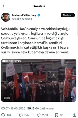 26. Siyasi iktidar yanlısı, Cumhuriyet, laiklik ve Atatürk düşmanı Furkan Bölükbaşı sosyal medya hesabından 19 Mayıs Gençlik ve Spor Bayramına karşı yalan dolu bir paylaşım yaptı. Paylaşımda “Vahdeddin Han’ın emriyle cebine koyduğu servetle yola çıkan, İngilizlerin verdiği vizeyle Samsun’a geçen, Samsun’da İngiliz birliği tarafından karşılanan Kemal’in kendisini övdürmek için icat ettiği bir başka milli bayramı yüz yıl sonra hala kutlamaya devam ediyoruz” ifadeleri yer aldı. (19 Mayıs)