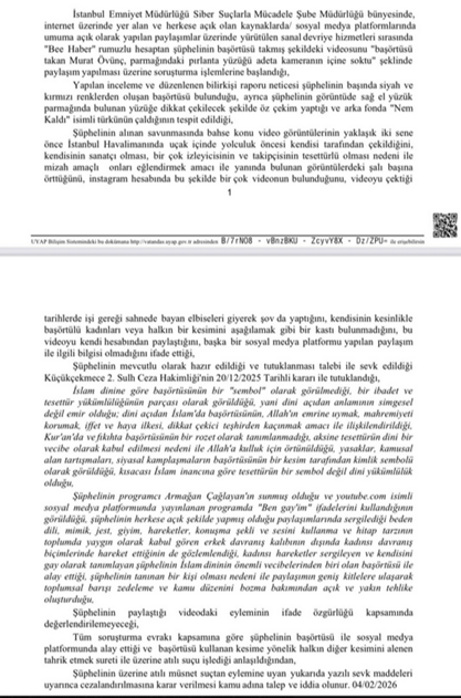 5. Başörtülü videosunun ardından “halkı kin ve düşmanlığa tahrik” suçlamasıyla tutuklanan Murat Övüç hakkında hazırlanan iddianame kabul edildi. Küçükçekmece Cumhuriyet Başsavcılığı’nın iddianamesinin kabulü sonrası tensip zaptı düzenleyen Küçükçekmece 5. Asliye Ceza Mahkemesi, duruşma tarihini 13 Mart 2026 olarak belirledi. Mahkeme, Övüç hakkındaki tahliye talebinin reddine ve tutukluluk halinin devamına karar verdi. İddianamede Övüç için “Kadınsı hareketler sergileyen ve kendisini gay olarak tanımlayan şüphelinin İslam dininin önemli vecibelerinden biri olan başörtüsü ile alay ettiği, şüphelinin tanınan bir kişi olması nedeni ile paylaşımın geniş kitlelere ulaşarak toplumsal barışı zedeleme ve kamu düzenini bozma bakımından açık ve yakın tehlike oluşturduğu” ifadeleri yer aldı. (16 Şubat)