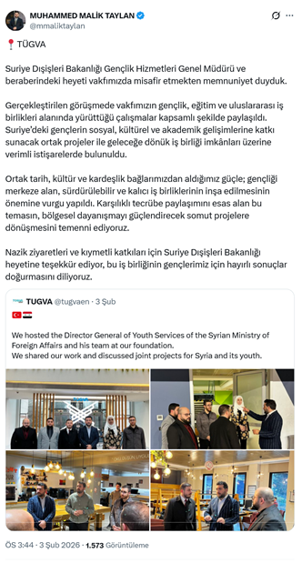 2. Suriye’yi ele geçiren cihatçı terör örgütü HTŞ’nin Dışişleri Bakanlığı Gençlik Hizmetleri Genel Müdürü ile beraberindeki heyet AKP’li Cumhurbaşkanı R.T. Erdoğan’ın oğlu Bilal Erdoğan’ın yöneticilerinden olduğu TÜGVA’yı ziyaret etti. Vakfın genel başkan yardımıcısı ve dış ilişkiler koordinatörü ünvanınan sahip Muhammed Malik Taylan, sosyal medya hesabından yaptığı paylaşımda, “Suriye Dışişleri Bakanlığı Gençlik Hizmetleri Genel Müdürü ve beraberindeki heyeti vakfımızda misafir etmekten memnuniyet duyduk. Gerçekleştirilen görüşmede vakfımızın gençlik, eğitim ve uluslararası iş birlikleri alanında yürüttüğü çalışmalar kapsamlı şekilde paylaşıldı. Suriye’deki gençlerin sosyal, kültürel ve akademik gelişimlerine katkı sunacak ortak projeler ile geleceğe dönük iş birliği imkânları üzerine verimli istişarelerde bulunuldu. Ortak tarih, kültür ve kardeşlik bağlarımızdan aldığımız güçle; gençliği merkeze alan, sürdürülebilir ve kalıcı iş birliklerinin inşa edilmesinin önemine vurgu yapıldı. Karşılıklı tecrübe paylaşımını esas alan bu temasın, bölgesel dayanışmayı güçlendirecek somut projelere dönüşmesini temenni ediyoruz. Nazik ziyaretleri ve kıymetli katkıları için Suriye Dışişleri Bakanlığı heyetine teşekkür ediyor, bu iş birliğinin gençlerimiz için hayırlı sonuçlar doğurmasını diliyoruz.” dedi. (3 Şubat)