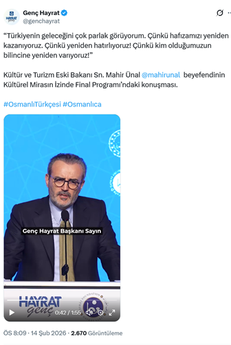 4. AKP’li eski Kültür ve Turizm Eski Bakanı Mahir Ünal Millî Eğitim Bakanlığı’nın Hayrat Vakfı ile imzaladığı iş birliği protokolü kapsamında “Genç Hayrat” tarafından Cumhurbaşkanlığı Devlet Arşivleri Başkanlığı Osmanlı Arşivi Külliyesi’nde düzenlenen “Kültürel Mirasın İzinde Osmanlı Türkçesi Yarışması” finaline katılarak konuşma yaptı. Ünal konuşmasında “Sayın cumhurbaşkanımızın dediği gibi, her şeyden önce bu medeniyet dairesindeki bu kültürel mirasla varız ve kültürel mirasın taşıyıcısı da dildir. Bir diliniz yoksa kültürel mirasın da taşıyıcısı olamazsınız. Yani bugün o büyük Osmanlı Selçuklu mirasının taşıyıcısı burada ekranda gördüğünüz dildir. Bu mirası bu dil ile birlikte yaşıyacağız ve bizim zihnimizin temel yapı taşları olan kelimeler ve kavramların ruhunu ve anlamını da bu dil ihya ediyor. Türkiye’nin geleceğini çok parlak görüyorum. Çünkü hafızamızı yeniden kazanıyoruz. Çünkü yeniden hatırlıyoruz. Kim olduğumuzun bilincine yeniden varıyoruz.” ifadelerini kullandı. (12 Şubat)