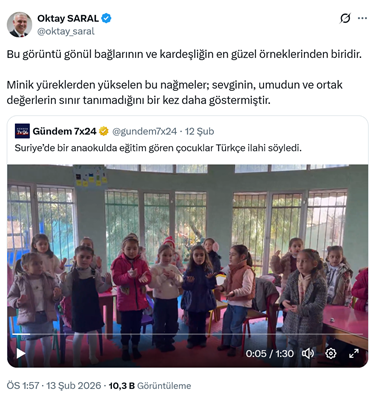 5. AKP’li Cumhurbaşkanı baş danışmanı Oktay Saral, sosyal medya hesabından Suriye’deki bir anaokulunda Türkçe ilahiler söyletilen çocukların videosunu paylaşarak “Bu görüntü gönül bağlarının ve kardeşliğin en güzel örneklerinden biridir. Minik yüreklerden yükselen bu nağmeler; sevginin, umudun ve ortak değerlerin sınır tanımadığını bir kez daha göstermiştir.” dedi. (13 Şubat)