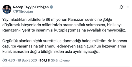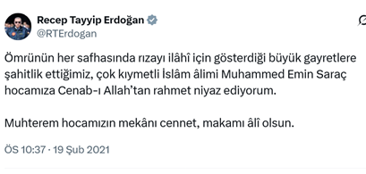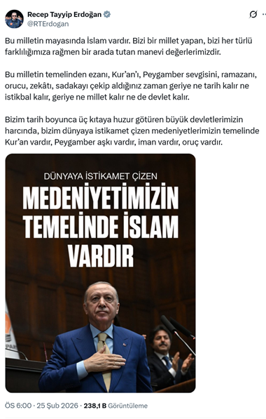 18. AKP’li Cumhurbaşkanı R.T. Erdoğan, sosyal medya hesabından yaptığı paylaşımda, “Bu milletin mayasında İslam vardır. Bizi bir millet yapan, bizi her türlü farklılığımıza rağmen bir arada tutan manevi değerlerimizdir. Bu milletin temelinden ezanı, Kur’an’ı, Peygamber sevgisini, ramazanı, orucu, zekâtı, sadakayı çekip aldığınız zaman geriye ne tarih kalır ne istikbal kalır, geriye ne millet kalır ne de devlet kalır. Bizim tarih boyunca üç kıtaya huzur götüren büyük devletlerimizin harcında, bizim dünyaya istikamet çizen medeniyetlerimizin temelinde Kur’an vardır, Peygamber aşkı vardır, iman vardır, oruç vardır.” dedi. (25 Şubat)
